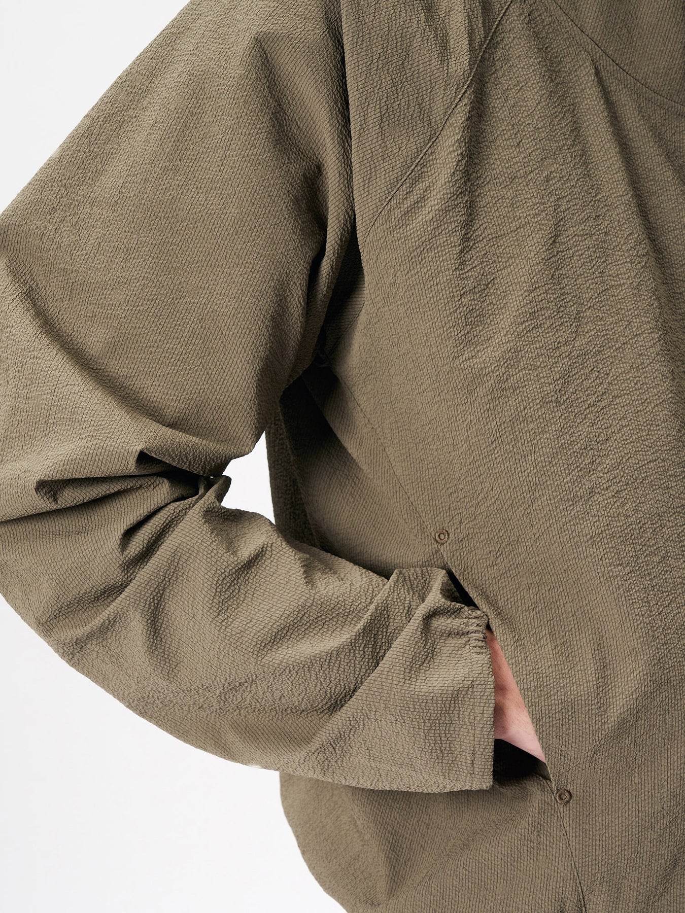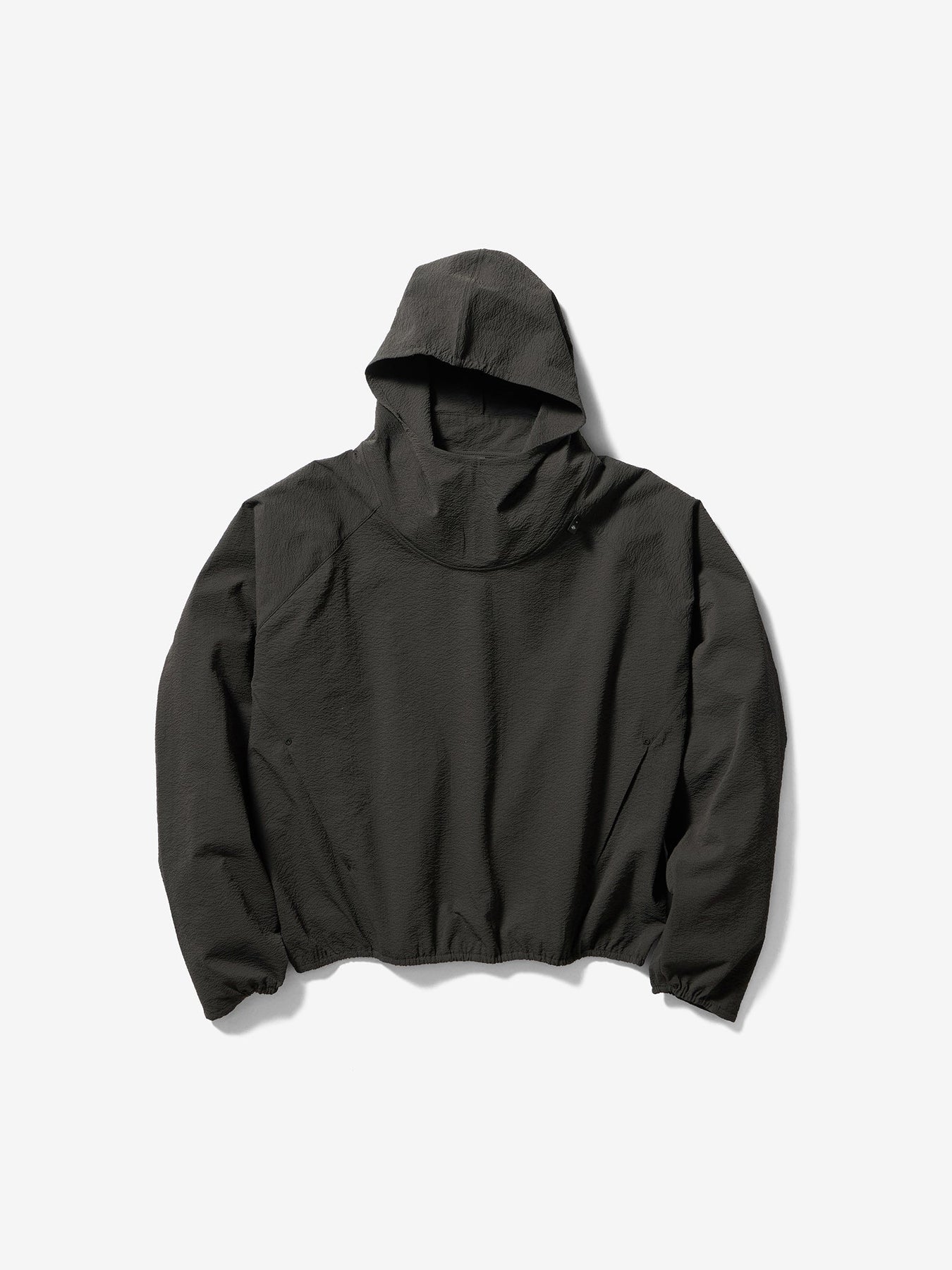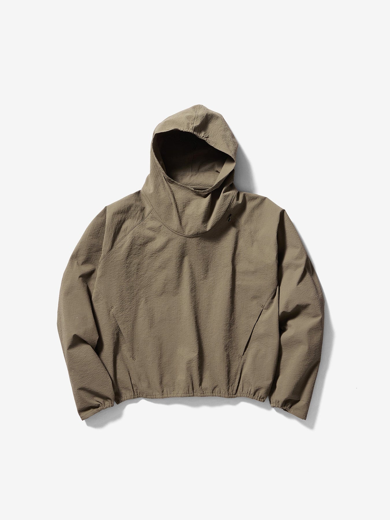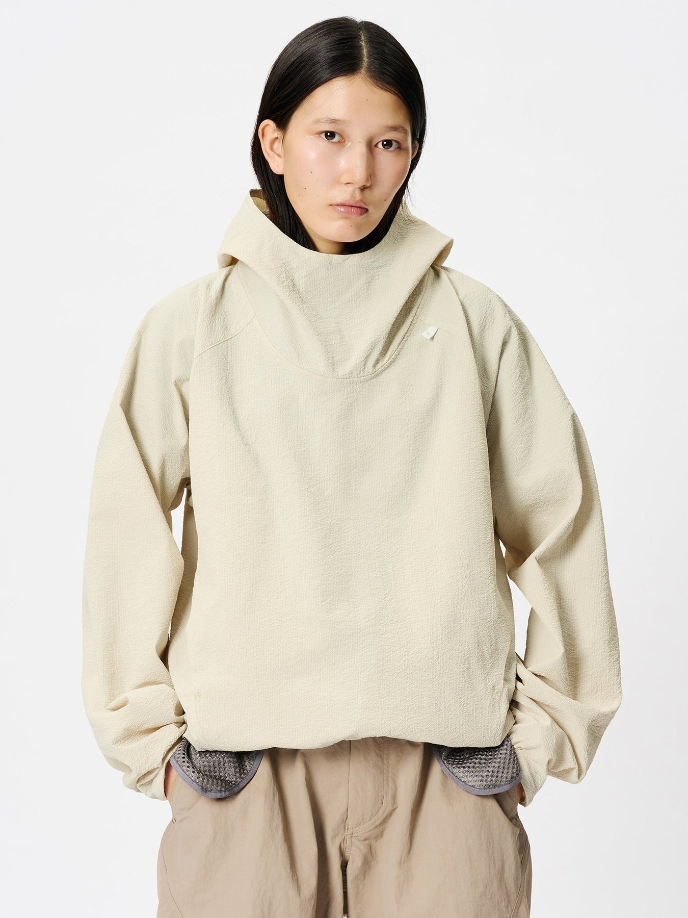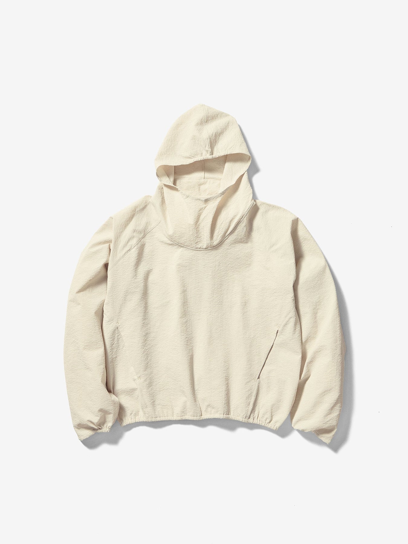 This anorak is made from a fabric featuring a finely rippled, wave-like texture. It offers moisture-wicking and quick-drying performance and is designed with built-in UV protection, tested according to AS/NZS 4399, the Australian/New Zealand standard for sun protective clothing, suitable for long hours outdoors. The relaxed silhouette allows air to circulate, while the textured fabric minimizes contact with the skin, ensuring comfort even in strong sunlight. A matching fabric stuff sack is included for compact storage of the garment.