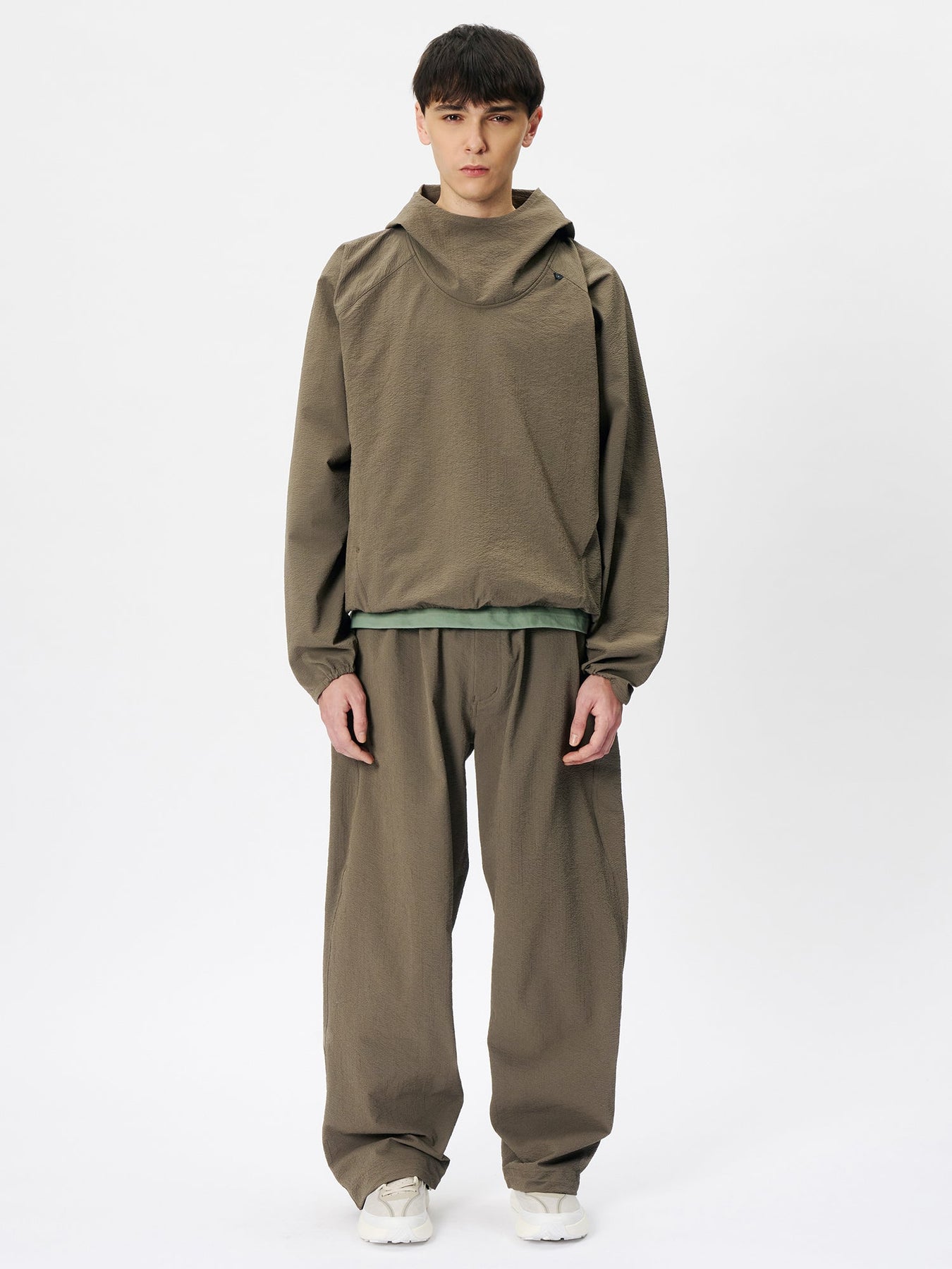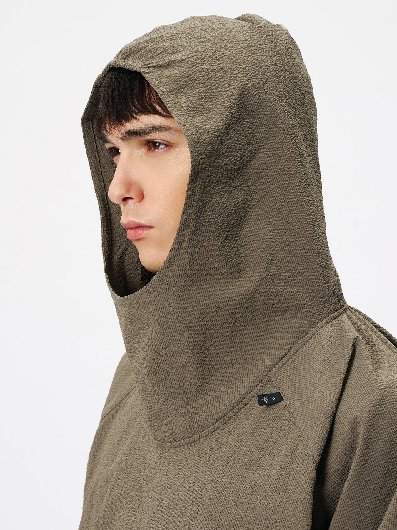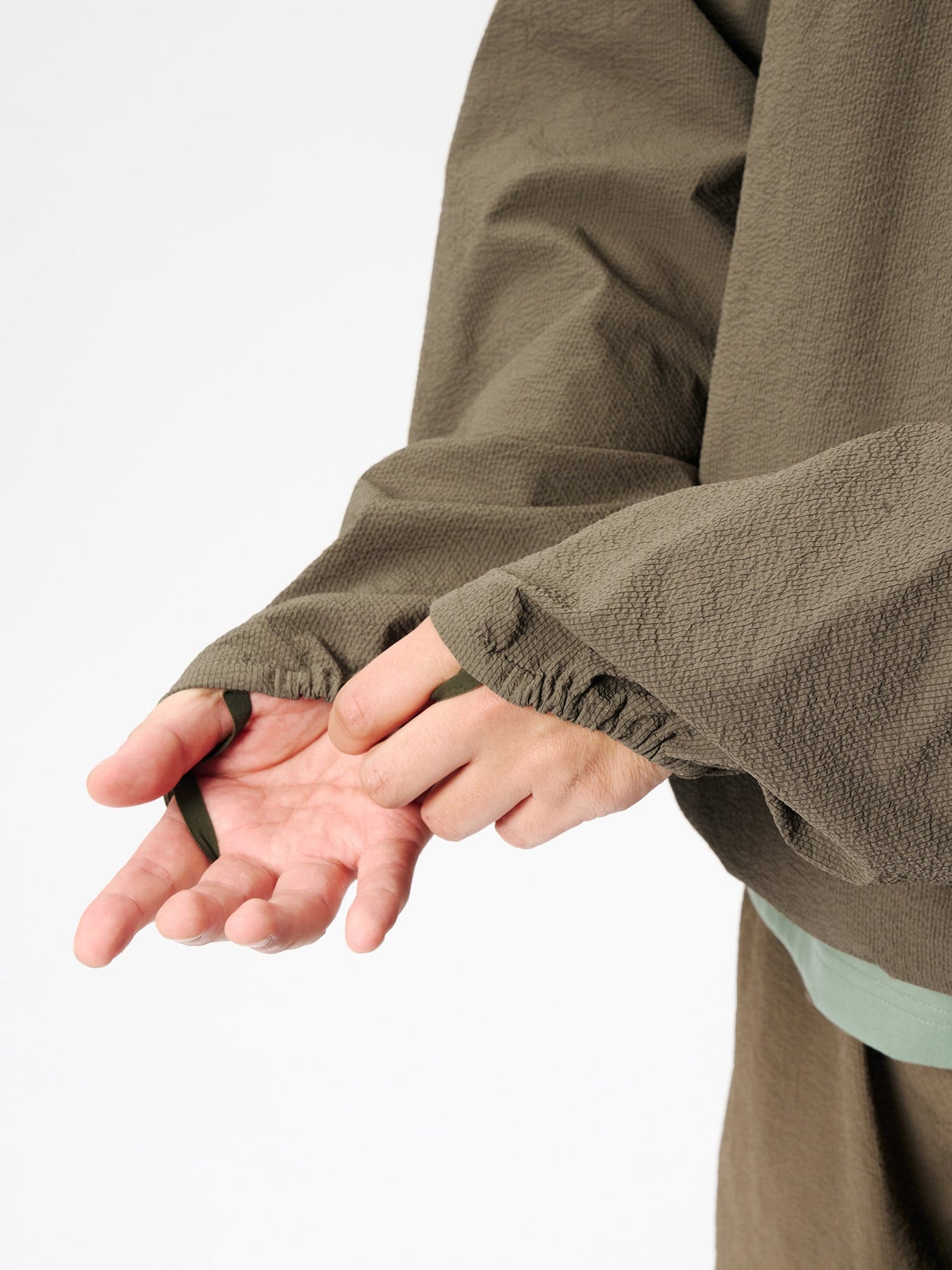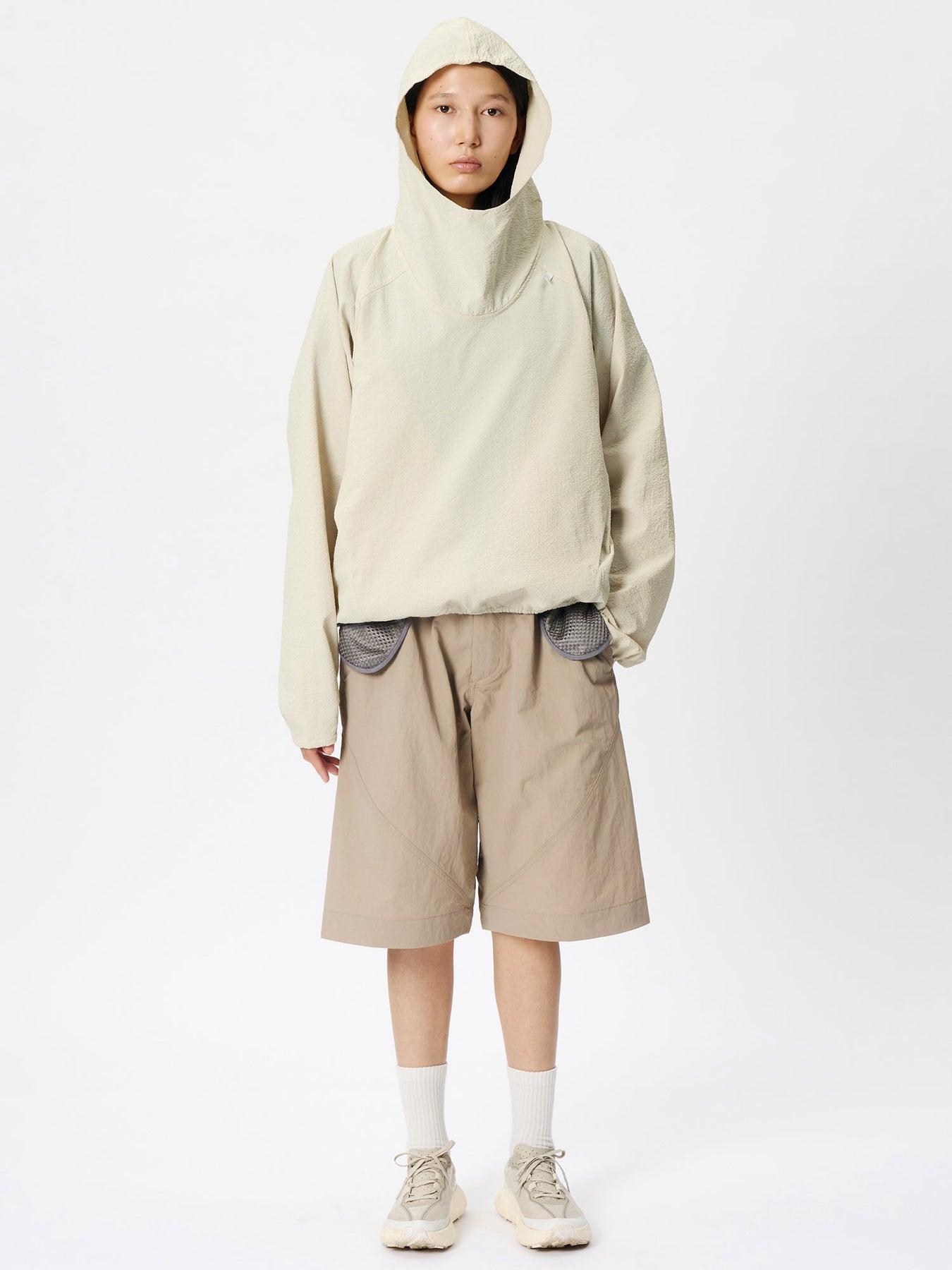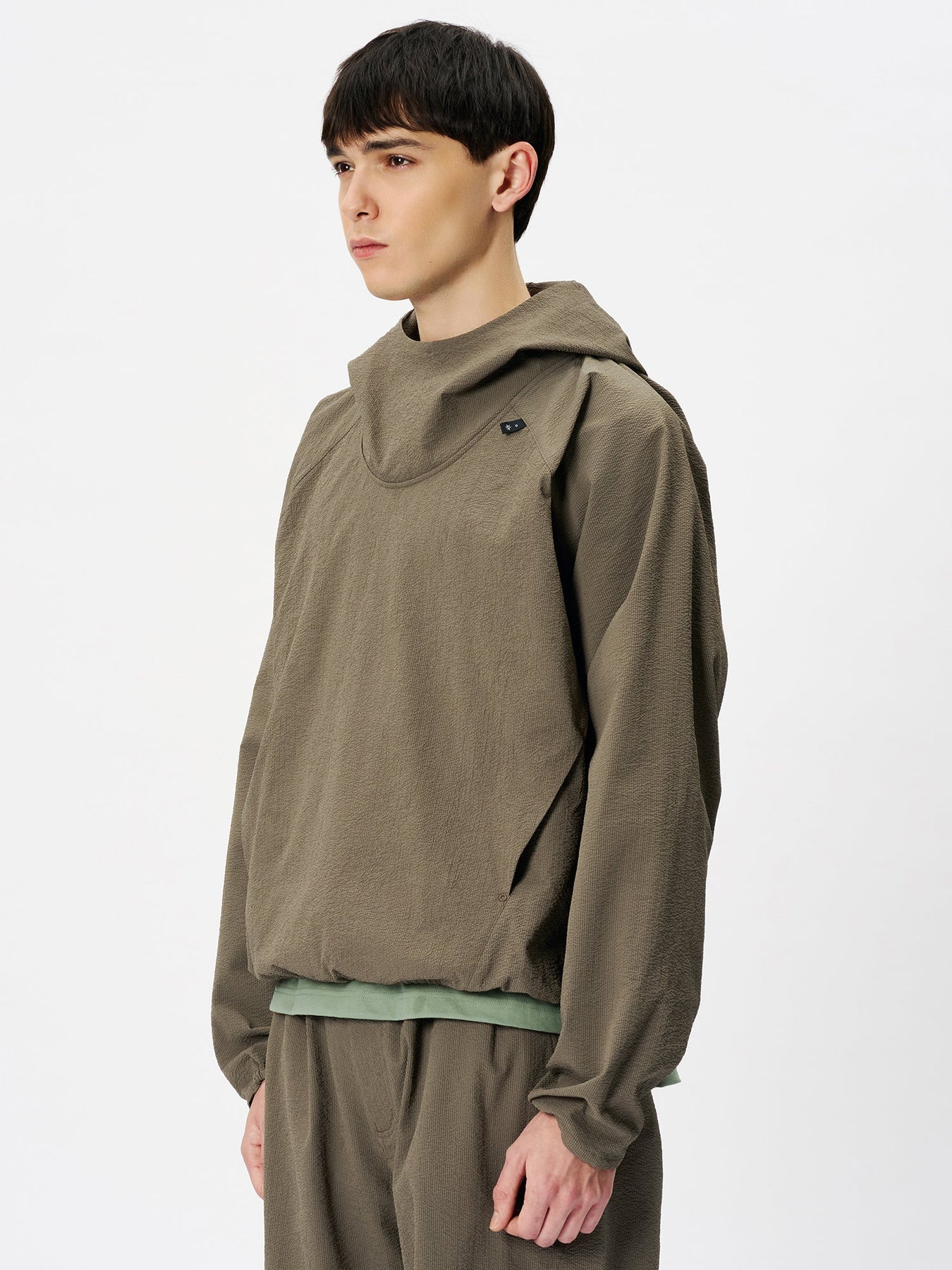 This anorak is made from a fabric featuring a finely rippled, wave-like texture. It offers moisture-wicking and quick-drying performance and is designed with built-in UV protection, tested according to AS/NZS 4399, the Australian/New Zealand standard for sun protective clothing, suitable for long hours outdoors. The relaxed silhouette allows air to circulate, while the textured fabric minimizes contact with the skin, ensuring comfort even in strong sunlight. A matching fabric stuff sack is included for compact storage of the garment.