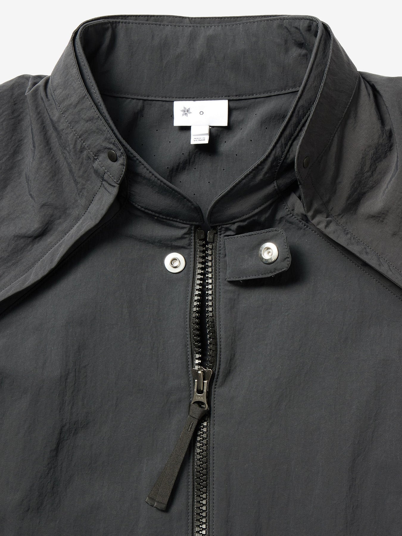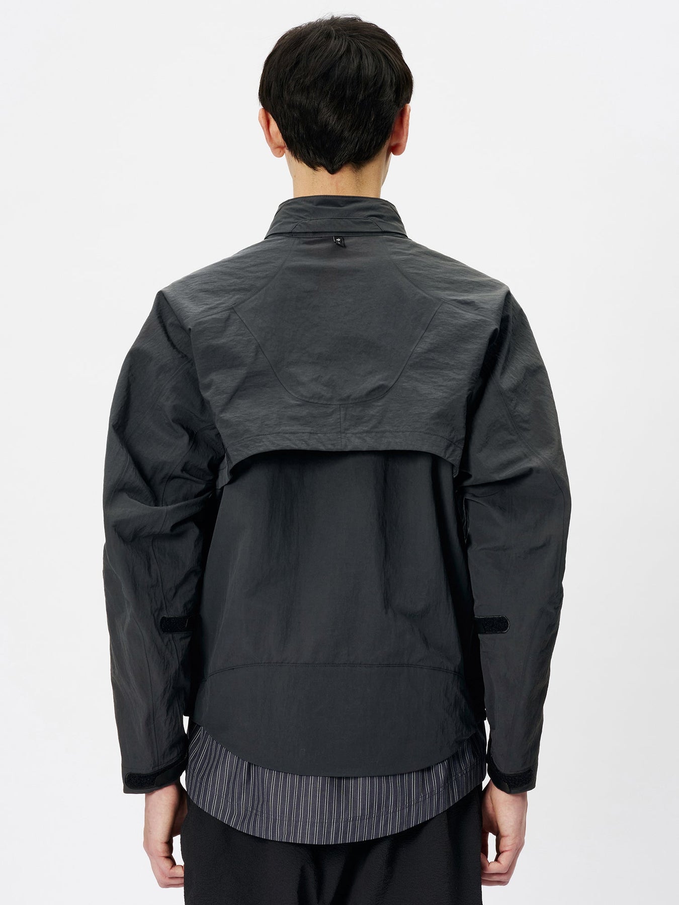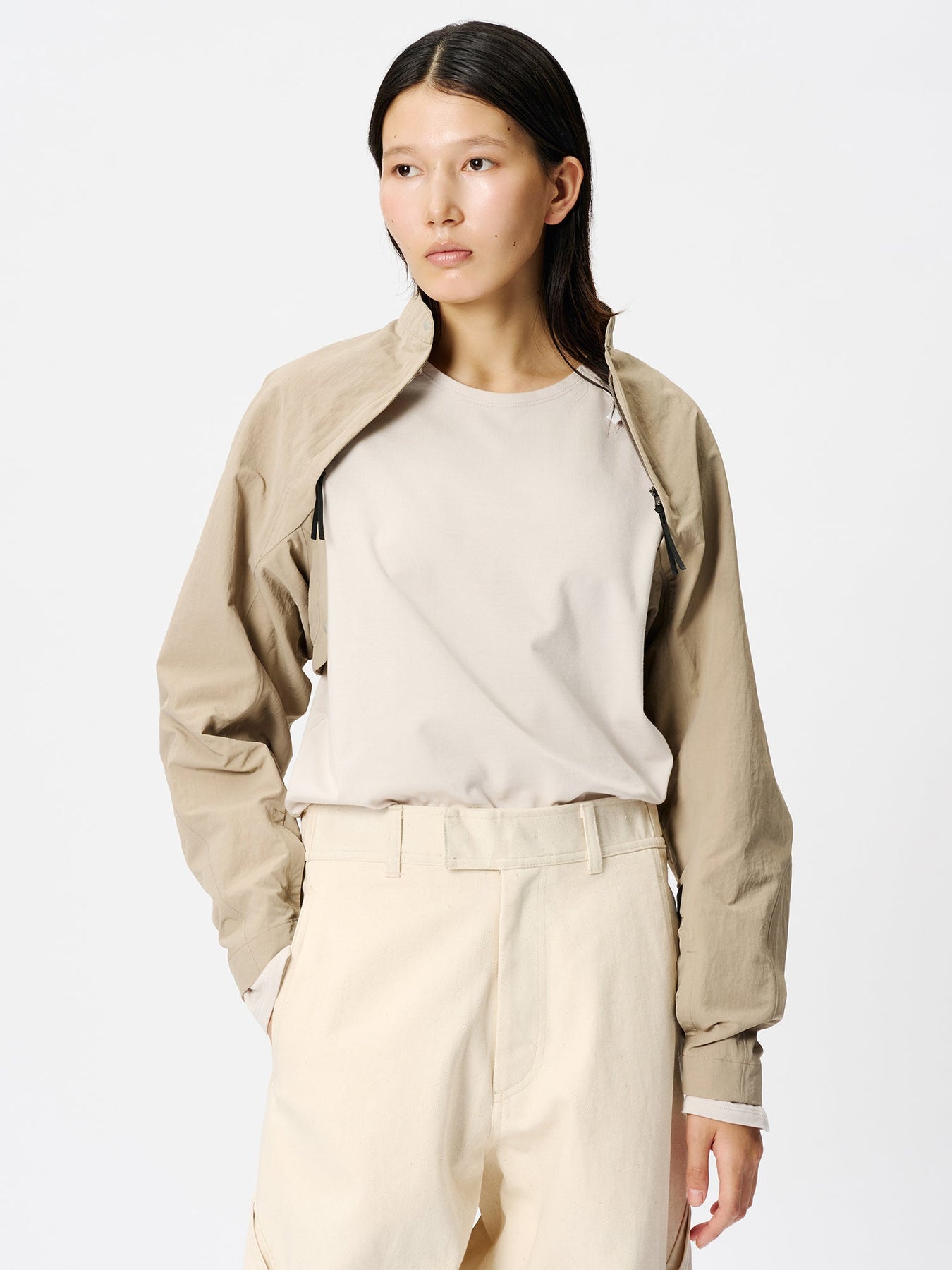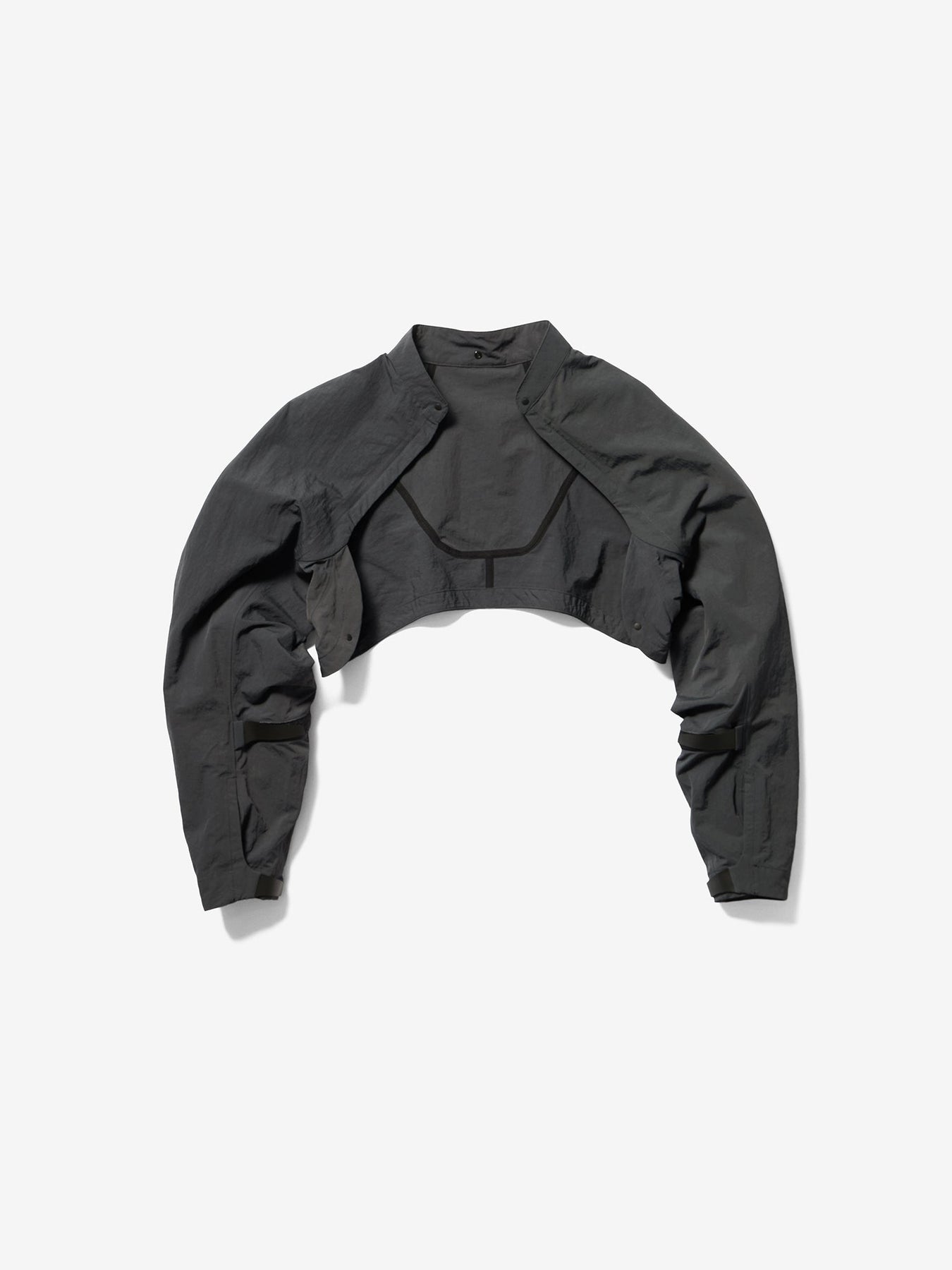 This short jacket features a structured, architectural silhouette. Its convertible design allows the bolero sleeves and vest body to be detached, offering versatile styling options. Adjustable tabs on the sleeves and hem ensure a customized fit, and the entire jacket is treated with a fluorine-free water-repellent finish.