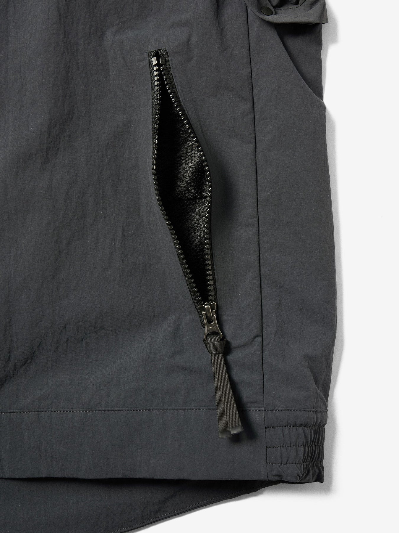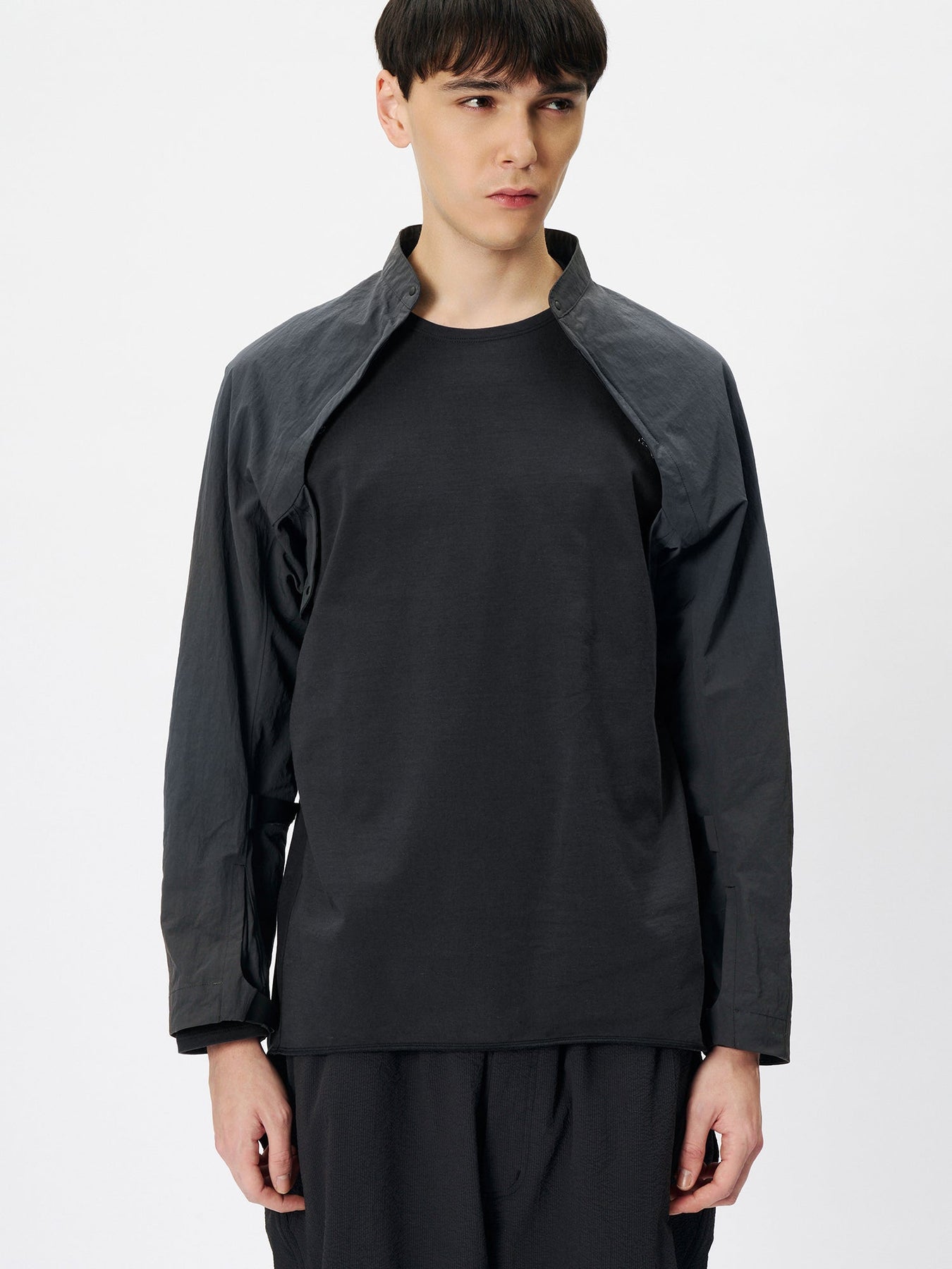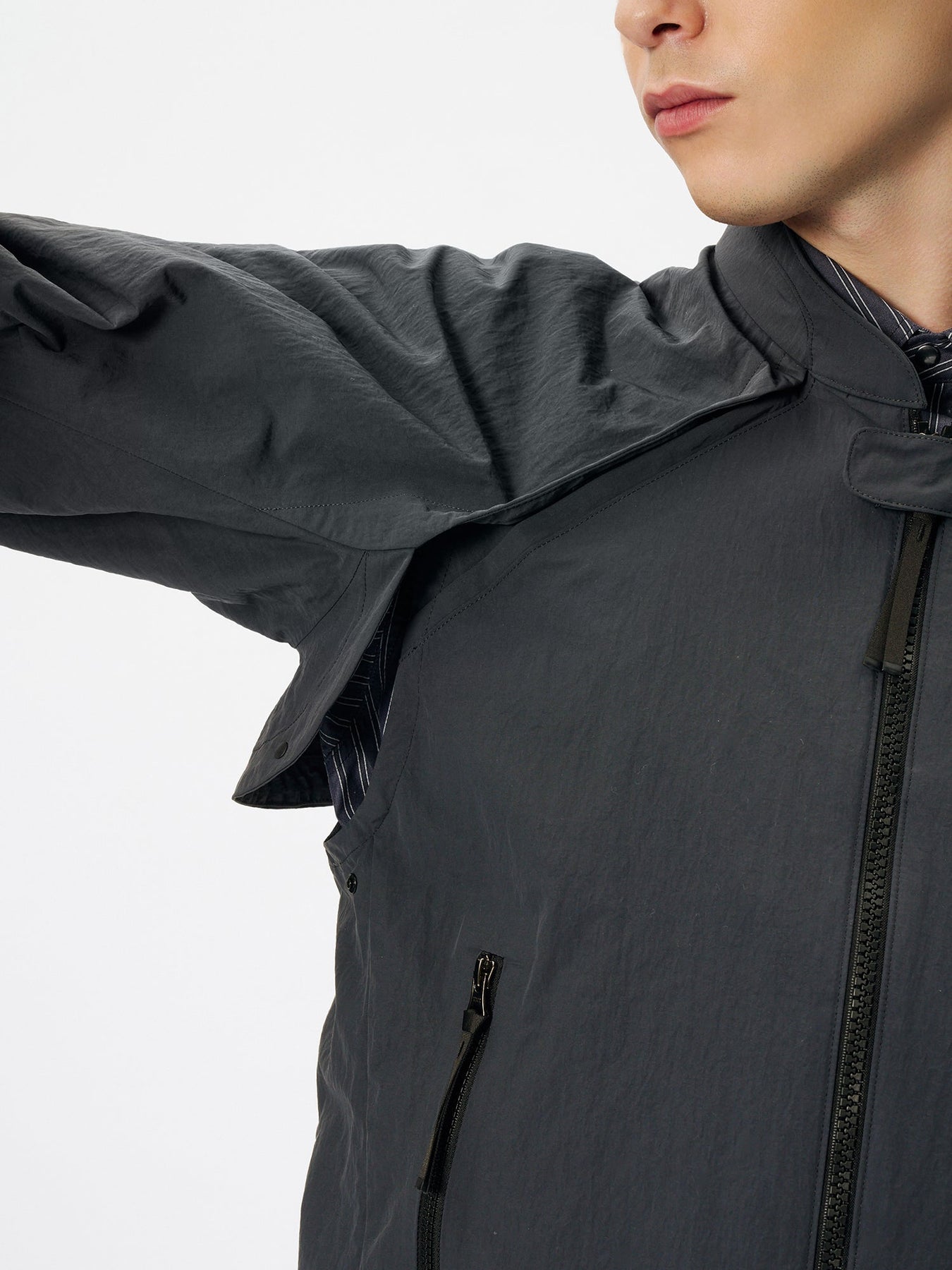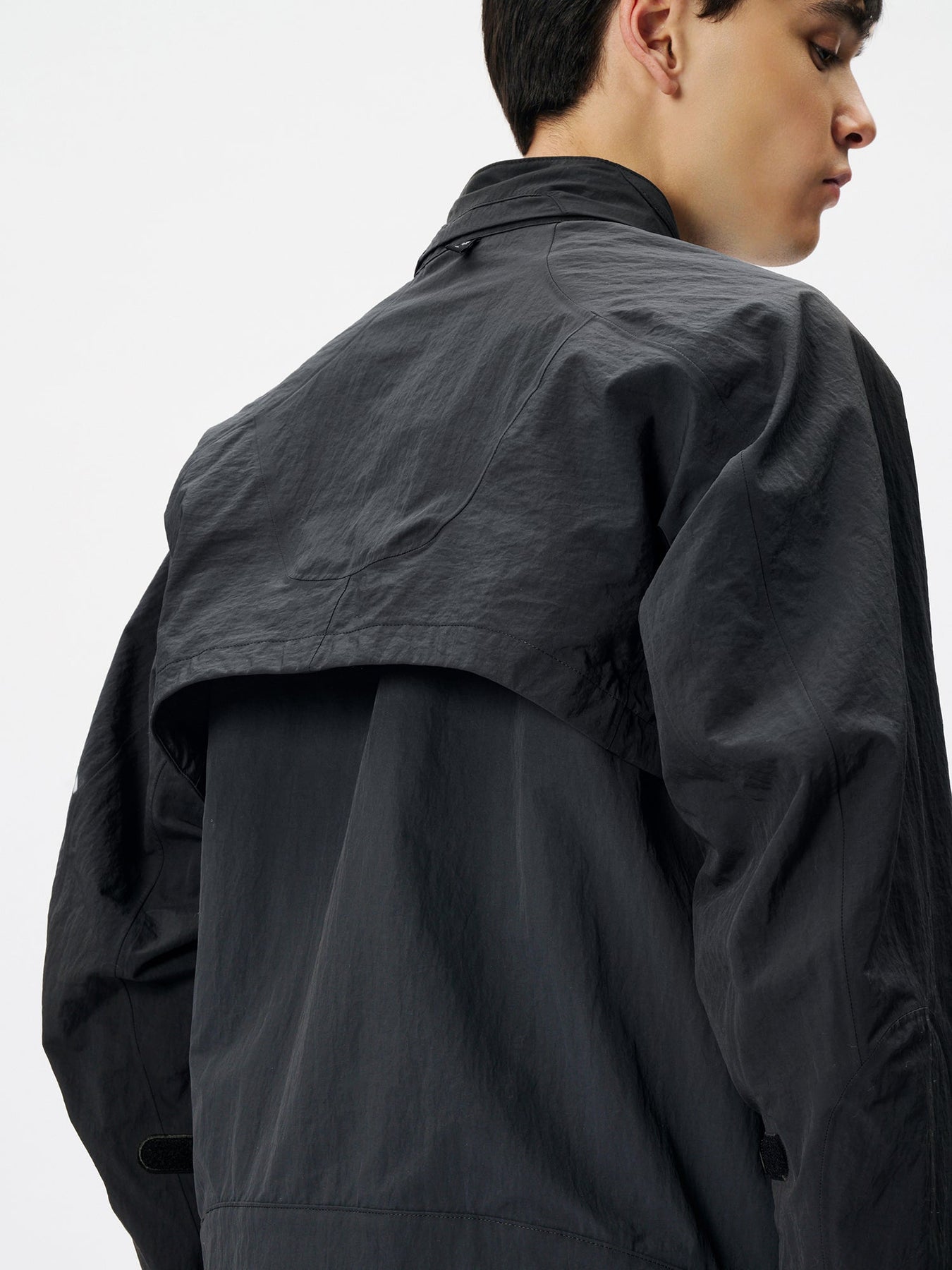 This short jacket features a structured, architectural silhouette. Its convertible design allows the bolero sleeves and vest body to be detached, offering versatile styling options. Adjustable tabs on the sleeves and hem ensure a customized fit, and the entire jacket is treated with a fluorine-free water-repellent finish.