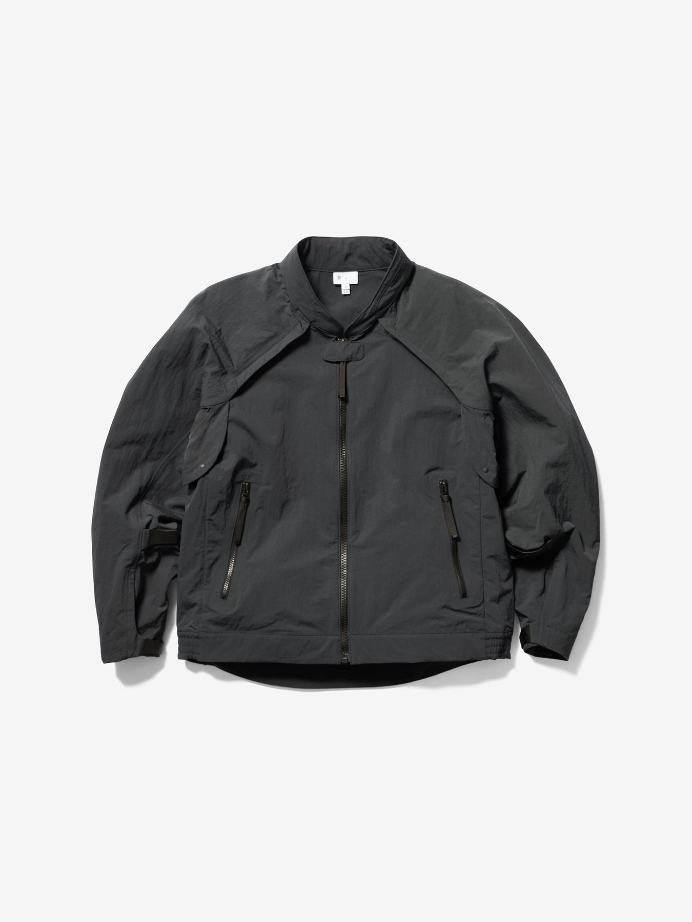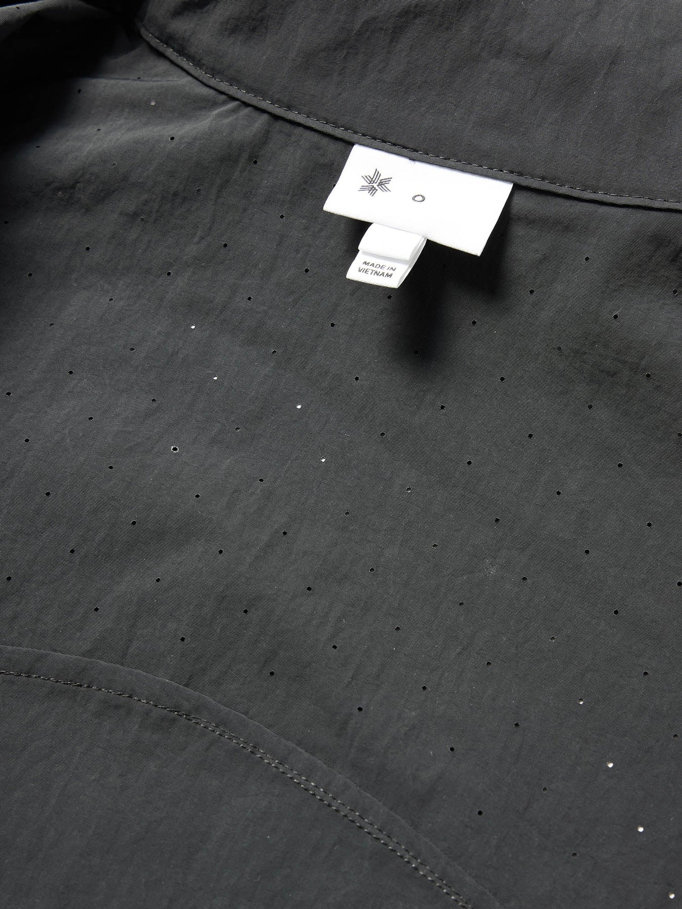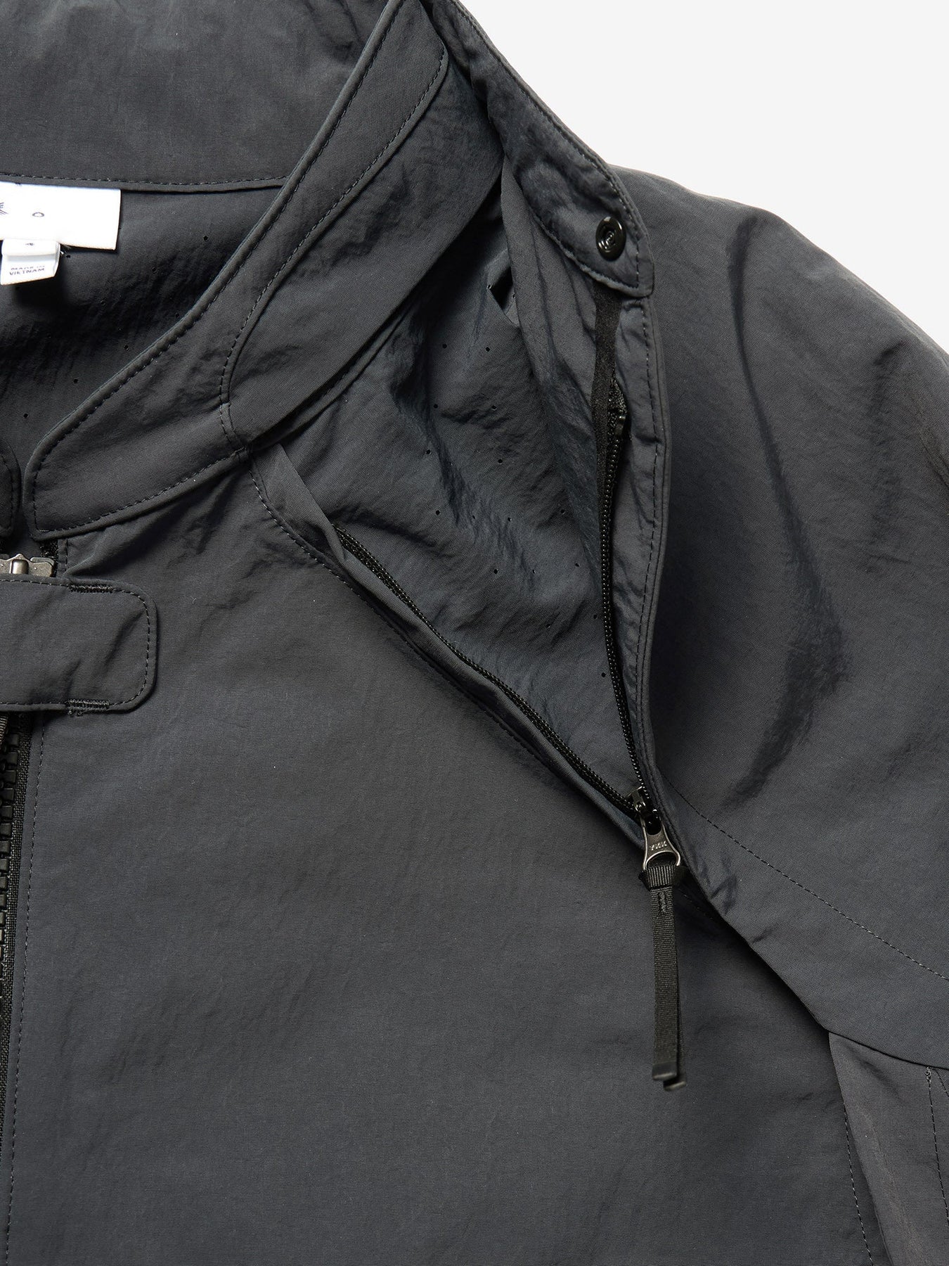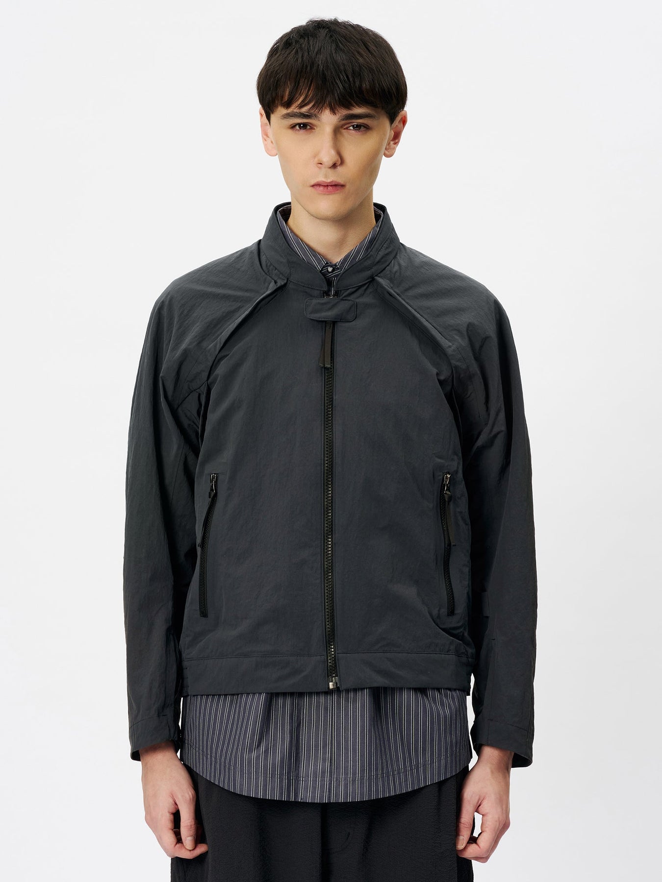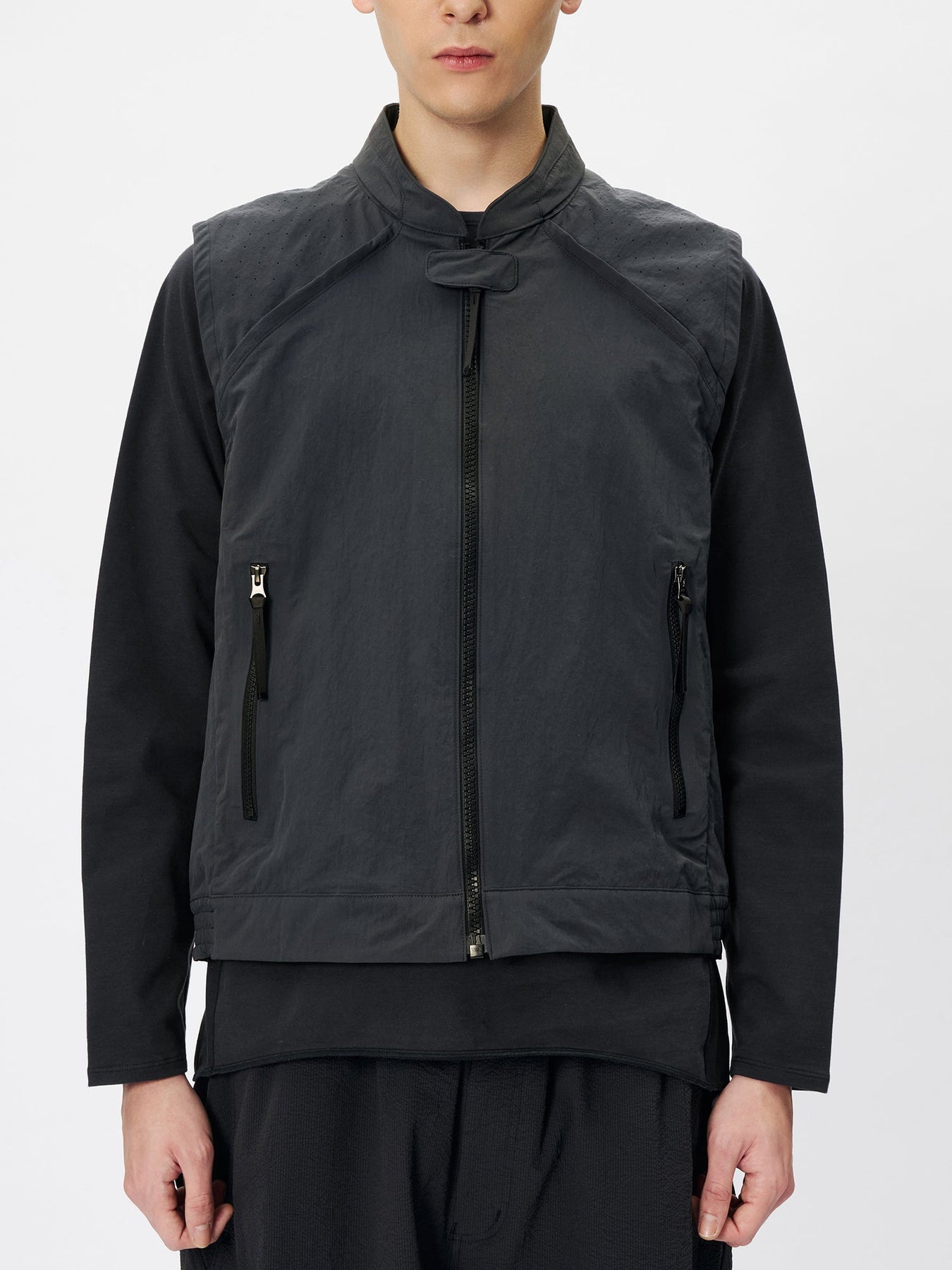This short jacket features a structured, architectural silhouette. Its convertible design allows the bolero sleeves and vest body to be detached, offering versatile styling options. Adjustable tabs on the sleeves and hem ensure a customized fit, and the entire jacket is treated with a fluorine-free water-repellent finish.
