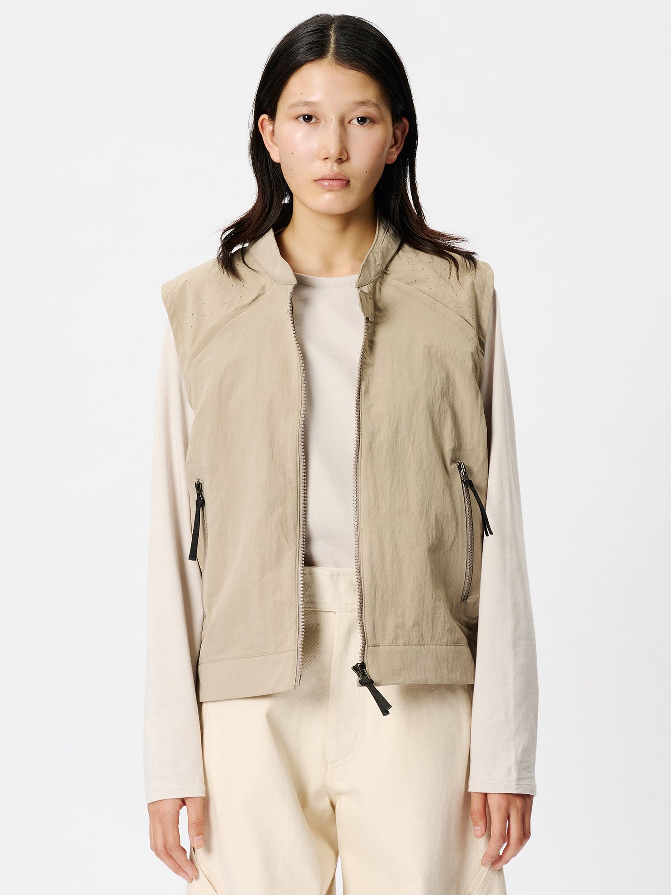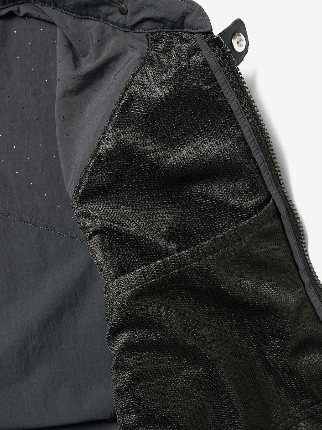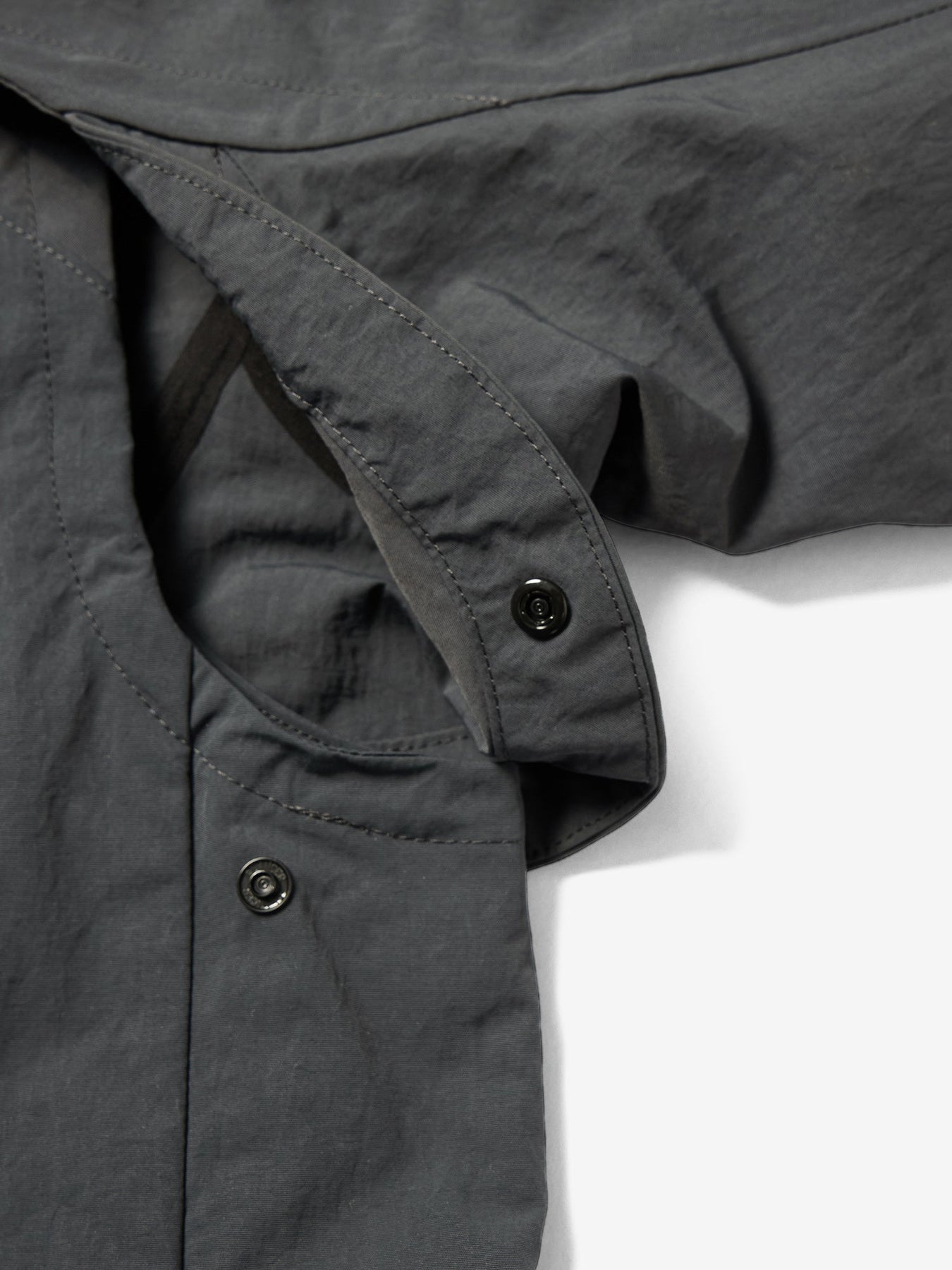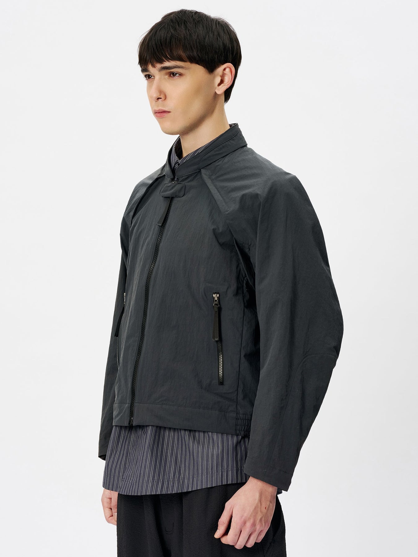 This short jacket features a structured, architectural silhouette. Its convertible design allows the bolero sleeves and vest body to be detached, offering versatile styling options. Adjustable tabs on the sleeves and hem ensure a customized fit, and the entire jacket is treated with a fluorine-free water-repellent finish.