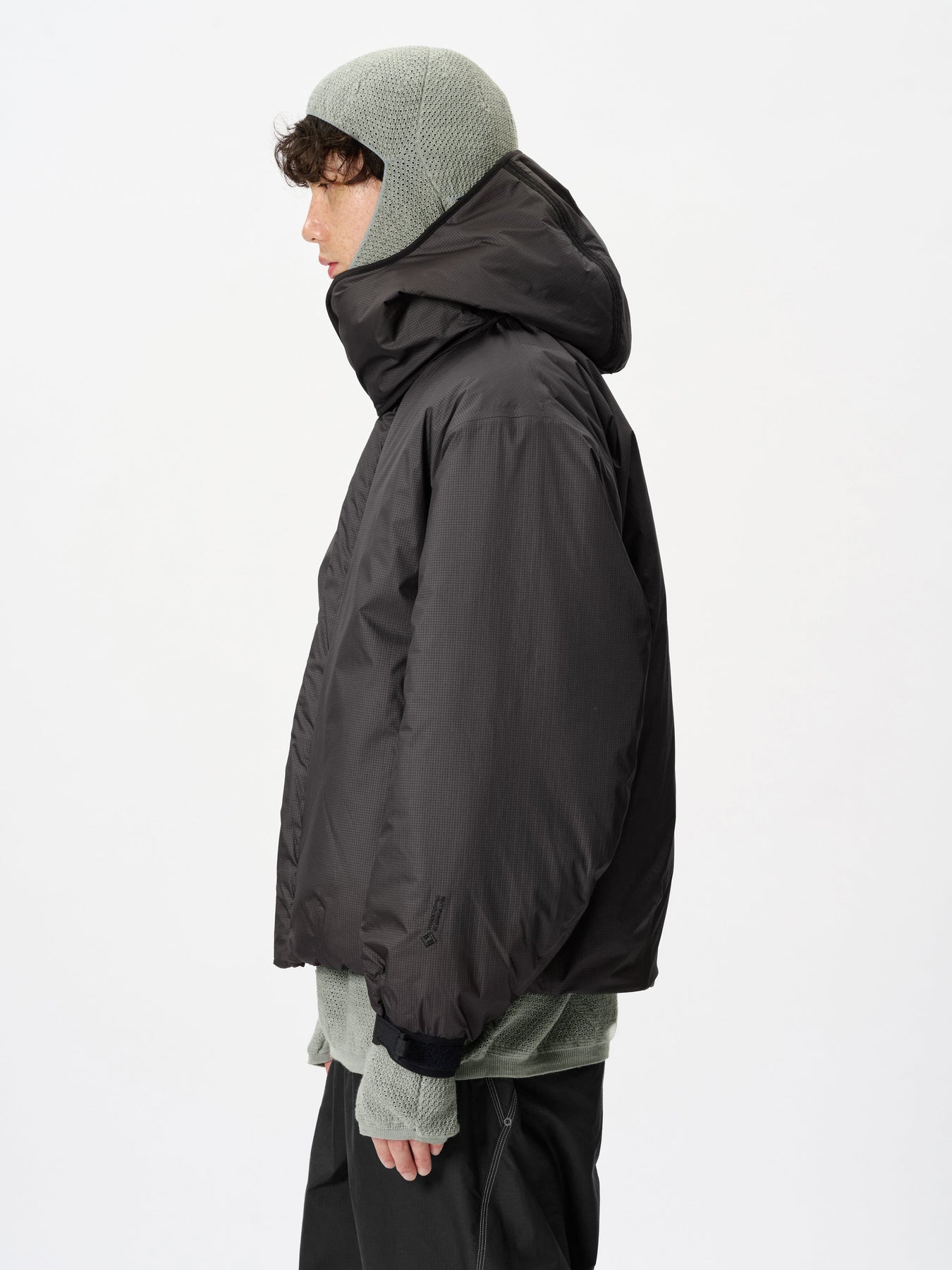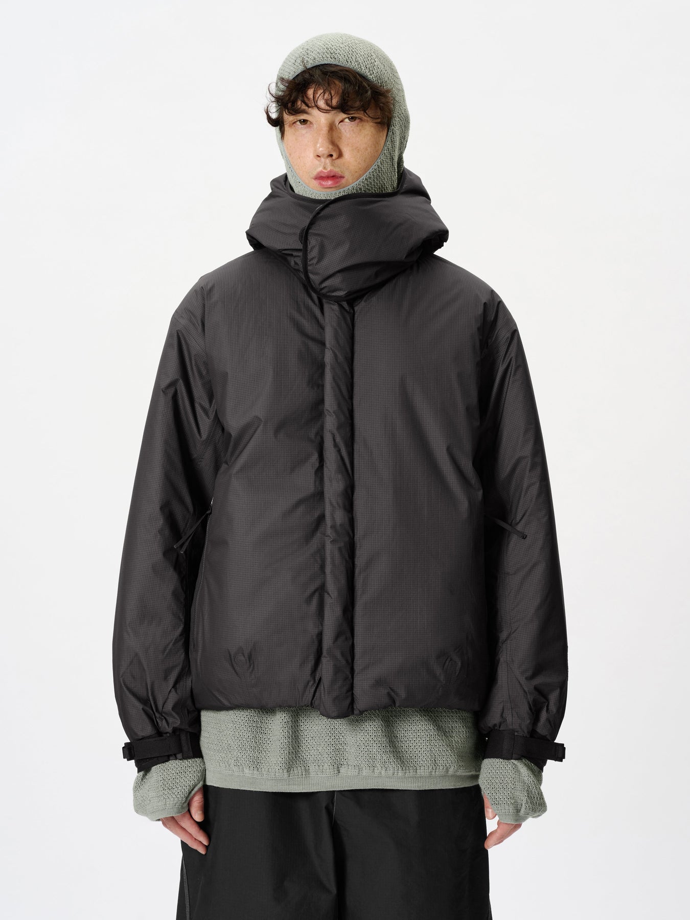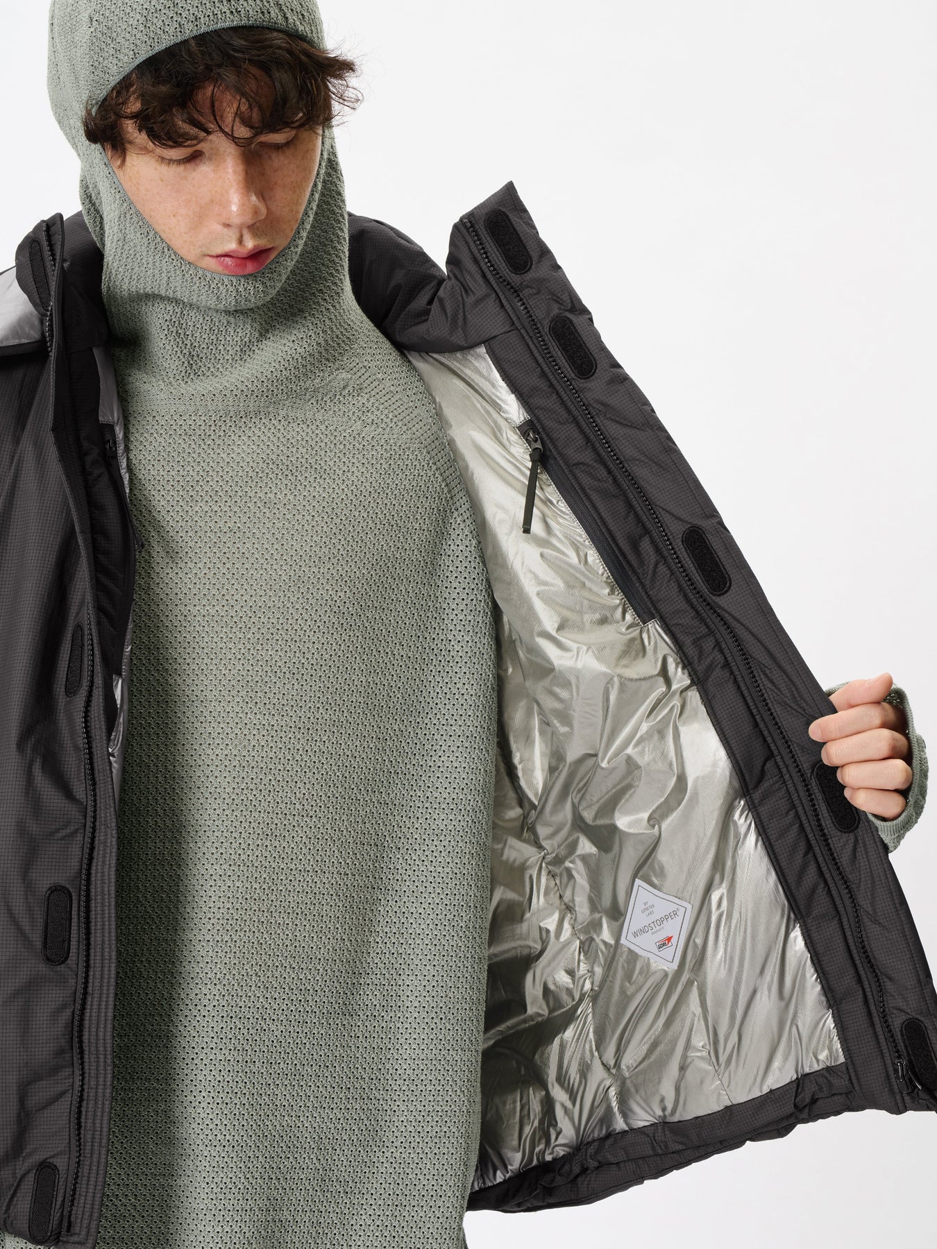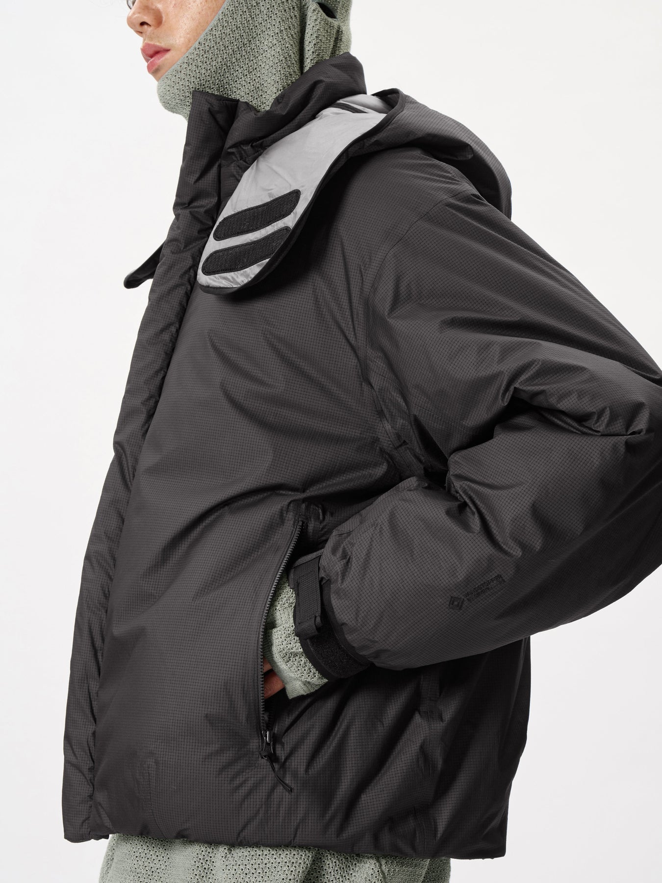 Goldwin 0’s FW25 collection explores new dimensions of functional design. A lightweight insulated cocoon-shaped outerwear piece with an oversized silhouette. Constructed with the lightest ripstop fabric from WINDSTOPPER by GORE-TEX LABS 2-layer laminate and filled with PrimaLoft. Select inner panels use titanium-sputtered fabric, enhancing radiant heat retention. Features a detachable insulated back pack for adjustable warmth and volume, and a removable hood.
