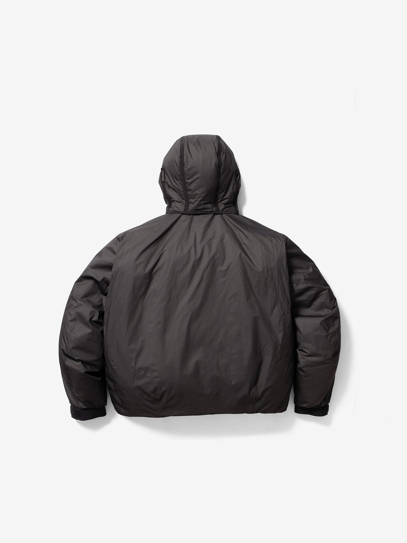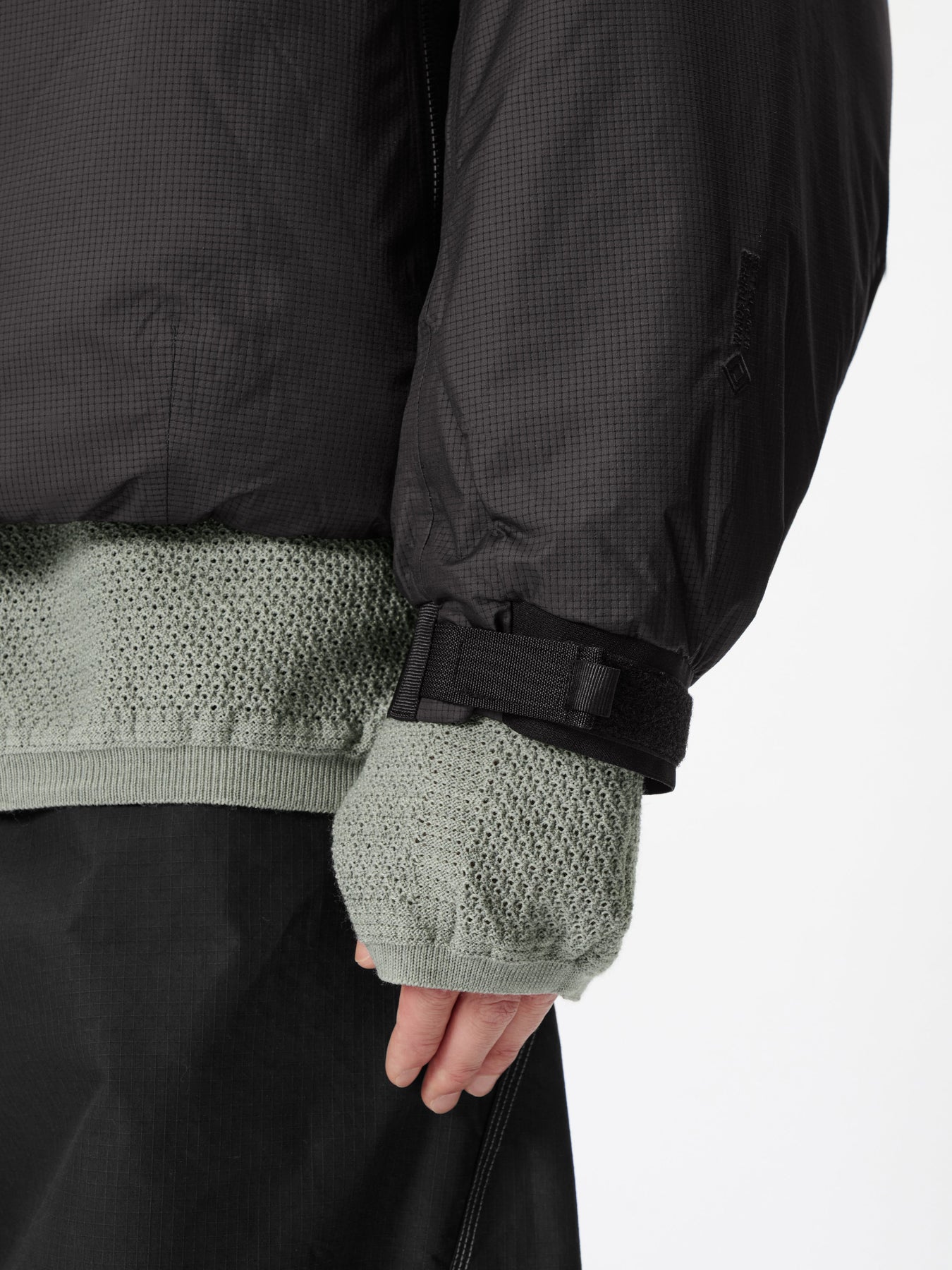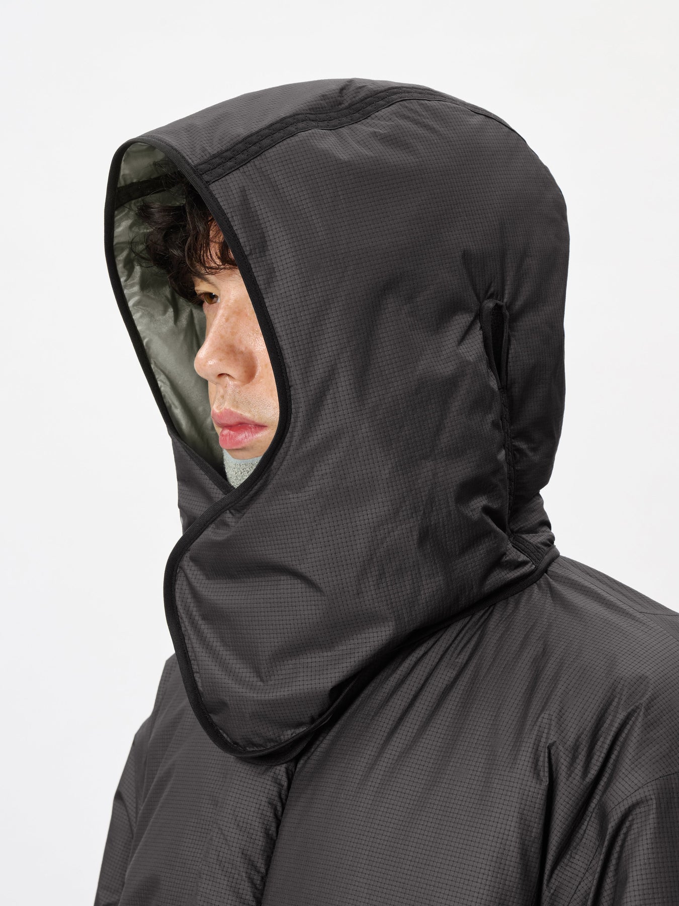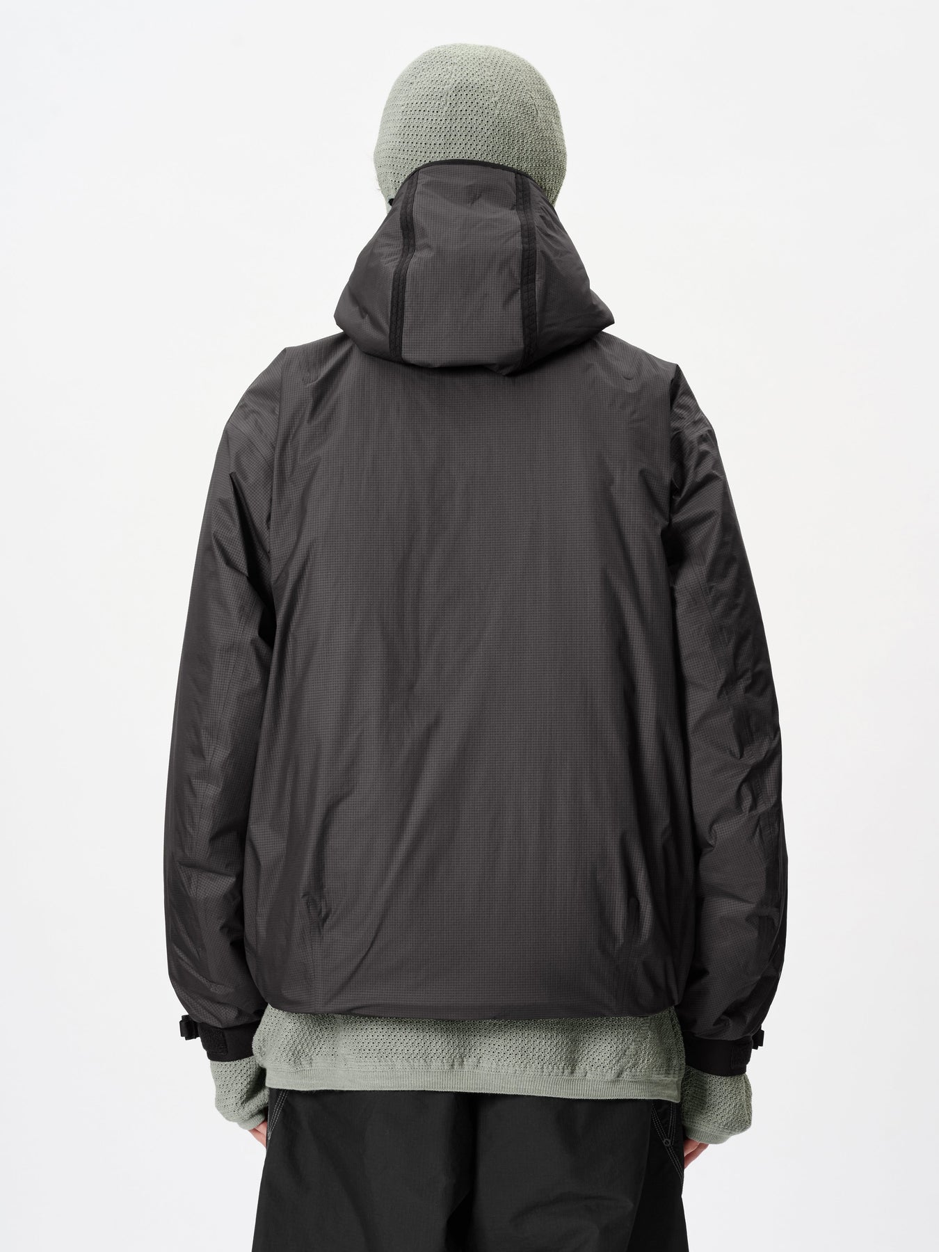 Goldwin 0’s FW25 collection explores new dimensions of functional design. A lightweight insulated cocoon-shaped outerwear piece with an oversized silhouette. Constructed with the lightest ripstop fabric from WINDSTOPPER by GORE-TEX LABS 2-layer laminate and filled with PrimaLoft. Select inner panels use titanium-sputtered fabric, enhancing radiant heat retention. Features a detachable insulated back pack for adjustable warmth and volume, and a removable hood.