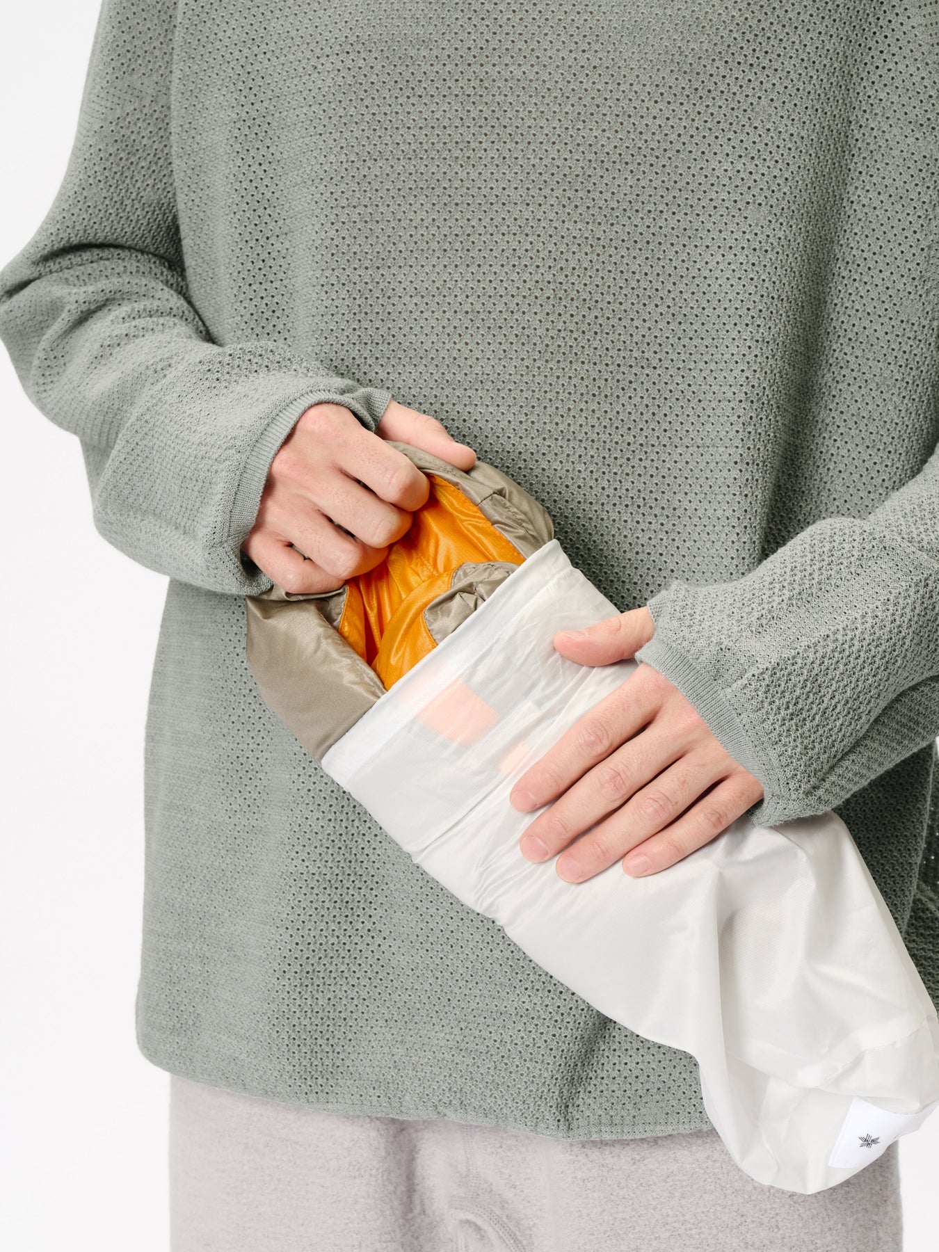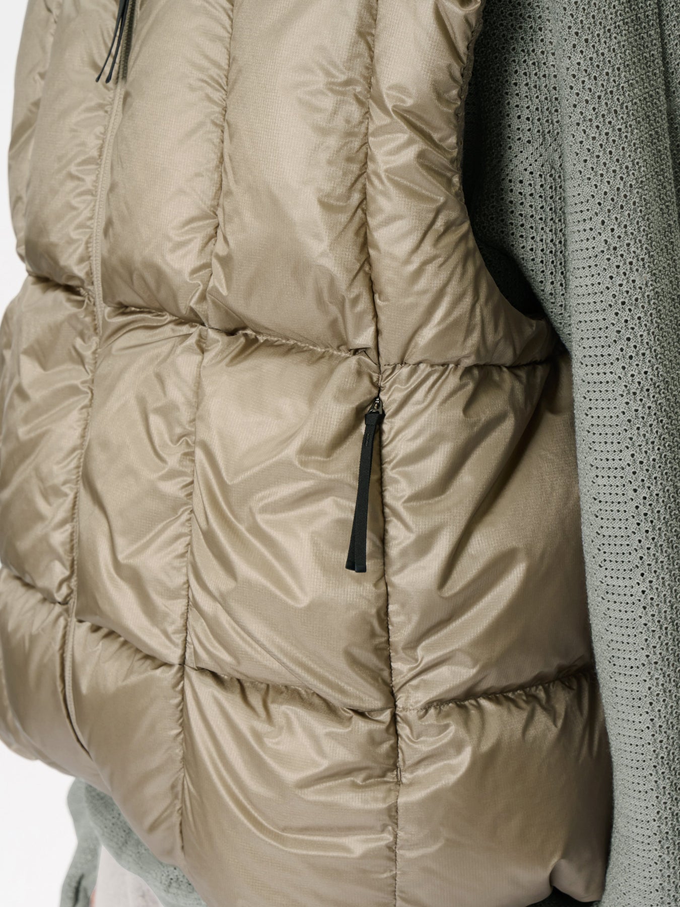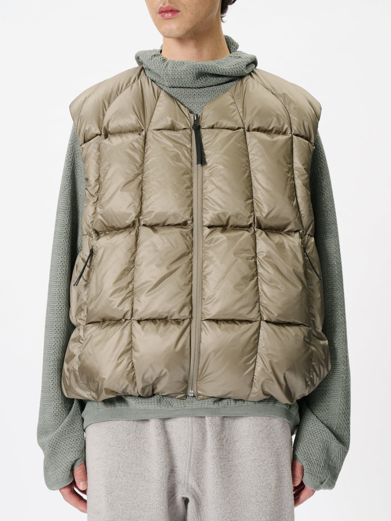 Goldwin 0’s FW25 collection redefines the balance of warmth and design innovation.A down vest featuring Goldwin’s original “3D Box Baffle” construction—pleated like origami to create dimensional chambers that maximize warmth. Can be worn as a standalone outer layer or over a jacket. Made with Pertex Diamond Fuse nylon, a fabric with silky luster and exceptional abrasion resistance.